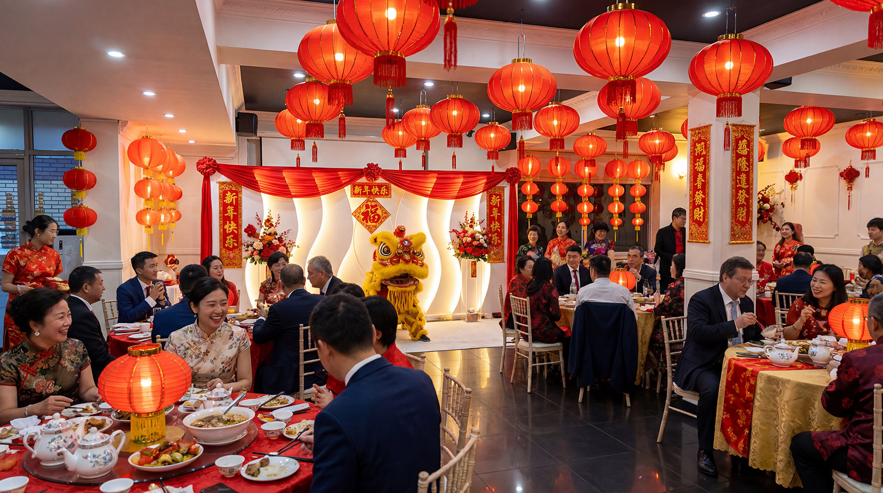 A vibrant and auspicious gathering welcoming prosperity and good fortune, featuring traditional décor, festive dining, cultural performances, and joyful community spirit.